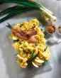 Cut the bacon slices into pieces. Clean the salad, wash and pat dry. Cut Batavia into strips. Clean, wash, quarter, seed and cut tomato into small cubes. Drain the bacon in a pan without fat, remove from the pan and set aside.