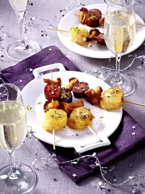 Clean the mushrooms, wash them thoroughly and let them drain. Cut the sausage into slices about 1 cm thick. Wash scallops cold and dab dry. Put mushrooms, slices of sausage and scallops alternately on 12 skewers.