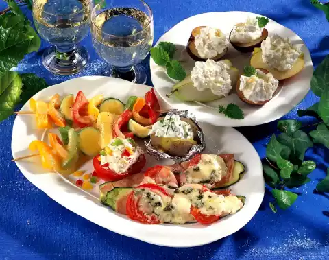 Drain and rinse with cold water. Put alternately on wooden skewers. Cover each with a slice of cheese. Bake zucchini slices and skewers together in a preheated oven (electric: 200 °C/ gas: level 3) for about 5 minutes.