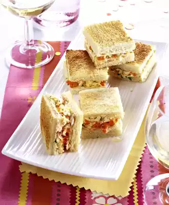 Toast bread, remove rind. Spread slices thinly with cream cheese on one side. Spread half of the slices with egg-surimi mix, spread salmon eggs on top. Cover with the remaining slices and press down lightly. Cut the sandwiches into quarters and serve cold