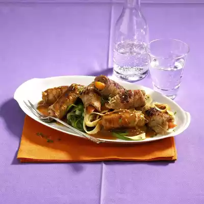 In the meantime clean and wash the carrots. Cook in boiling salted water for about 4 minutes, drain. Wash the veal, dab dry, tap flatter. Spread with horseradish, season with salt and pepper.