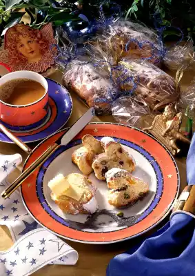 Knead the dough on a floured work surface, quarter it and shape it into four small stollen. Place the stollen on a baking tray lined with baking paper. Whisk the egg yolk and 1 tablespoon of water and brush the stollen with it.