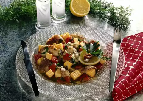 Embezzling oil and aquavit. Pour the vinaigrette over the salad before serving. Garnish with 1 slice of lemon, parsley, dill and anchovy fillets.