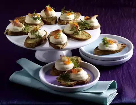 Heat butter in a pan, toast bread slices on both sides and season with salt. Pour the cream into a piping bag with a perforated spout and squirt it onto the cold bread chips. Wash the dill and dab dry. Garnish the trout cream with some caviar, trout and dill tips
