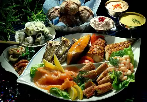 Mix mayonnaise, yoghurt and ketchup and season with salt, pepper and paprika powder. Fold in pieces of paprika. Arrange smoked fish and prawns on plates and garnish with lettuce leaves, lemon, tomato, dill and parsley.