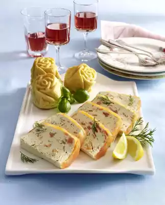 Soak gelatine in cold water. Roughly dice 200 g salmon, add 200 g cream cheese and puree. Add 400 g cream cheese, mustard and honey and mix to a smooth cream. Season with pepper. Squeeze the gelatine, dissolve and mix with lemon juice. Pour the gelatine into the salmon mousse while stirring. Chill the mousse for about 10 minutes. Finely dice 100 g salmon. Wash the dill, shake dry and chop finely, except for a little for garnishing. Fold the salmon and dill into the mousse and place in a silicone box mould (approx. 1 litre capacity, approx. 10 x 24 cm). Smooth and cover and leave to cool overnight. The next day, briefly place the mousse in the mould in hot water and turn it out onto a plate. Cover the mousse with 200 g salmon slices, press lightly and refrigerate again for about 1 hour. For the rose rolls, grease the hollows of a rose muffin tin (12 hollows of 90 ml each) well and dust with flour. Mix flour and baking powder in a mixing bowl. Add eggs, milk, oil, salt and sugar and mix. Spread the dough into the wells and bake in the preheated oven (electric cooker: 175 °C/ convection oven: 150 °C/ gas: level 2) for approx. 25 minutes. Let the rose rolls rest in the pan for about 5 minutes, then turn out of the pan and let them cool down. Cut salmon mousse into slices, arrange on a large plate and garnish with the remaining dill, lemon and basil. Serve with the rose rolls
