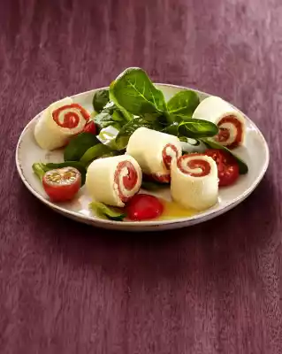 Wrap the rolls out of the foil and cut into pieces. Mix salad, tomatoes and vinaigrette, arrange on plates with rolls