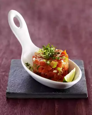 Squeeze the lime. Clean, wash and roughly chop the spring onion. Dice salmon finely. Mix with spring onion, oil and lime juice.