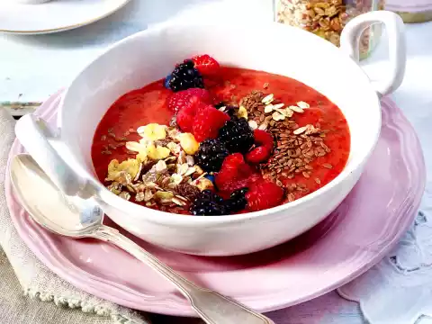 Berries selected. Pour smoothie into a bowl. Add berries, linseed and muesli.