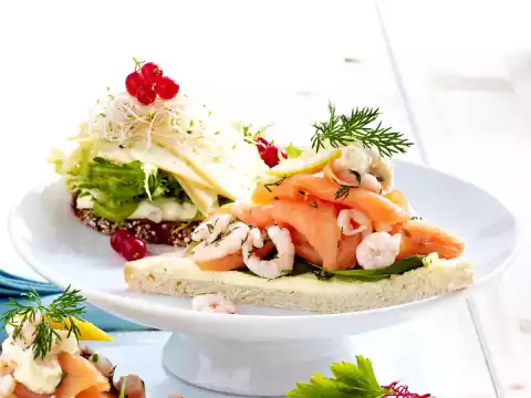 Wash and drain the prawns. Wash the dill and shake dry. Pluck the pennants and chop finely, except for something to garnish. Mix prawns with lemon juice and dill. Wash the spinach and drain well. Cut bread slices diagonally in half, brush with butter