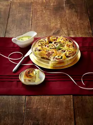 Roll up the dough from the long side and cut into about 6 pieces. Put them into an oil-coated and floured springform pan (approx. 26 cm Ø) with the cut surface facing upwards.