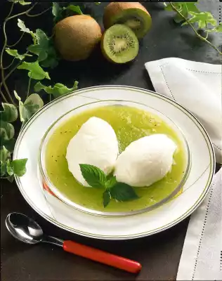 Peel the kiwis, dice them coarsely and puree them with the chopping stick. Pass through a sieve. Beat egg whites, vanilla sugar and sugar until stiff. Bring water (two fingers wide) to the boil in a wide pot.