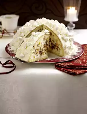 Crumble the meringue and whip 200 g cream until stiff. Turn the cake over and remove the foil. Spread the cake with the cream, sprinkle with the meringue crumbs and press lightly. Decorate with 1 cinnamon star and dust with a little cinnamon shortly before serving.