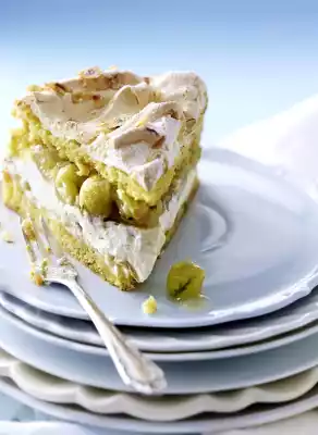 Beat the fat, 125 g sugar and vanillin sugar until creamy. Separate the eggs and stir in the egg yolks one after the other. Mix flour and baking powder and stir in briefly together with the milk. Grease a springform pan (26 cm Ø) and spread half of the dough. Beat the egg white until stiff, gradually fold in 200 g sugar. Spread half of the meringue mixture, slightly wavy, on the filled sponge mixture. Leave a 2-3 cm wide rim all around. Sprinkle with half of the hazelnut leaves
