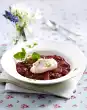 In the meantime, clean, wash and cut the rhubarb into small pieces. Put 100 ml water, 50-75 g sugar and rhubarb in a pot, bring to the boil, cover and simmer for about 5 minutes. Stir pudding powder and 4 tbsp. water until smooth, stir into the boiling rhubarb, bring to the boil again and simmer for about 1 minute, stirring continuously. Let cool off