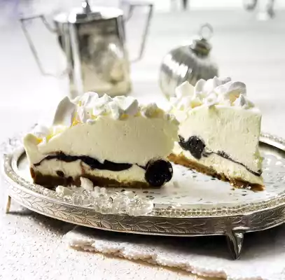 Whip the cream until stiff and fold into the cream. Spread some cream on the biscuit base. Spread the cherries on top. Spread the rest of the cream dome-shaped. Chill for at least 4 hours. Crumble the meringue and sprinkle on the cake.