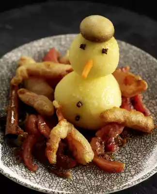 In the meantime take the dumplings out of the water. Cut larger dumplings straight on one side. Stick the dumplings together with wooden skewers to form snowmen. Garnish with cloves, carrot and mushrooms. Arrange tomatoes, fried tomato skin and snowmen on plates.