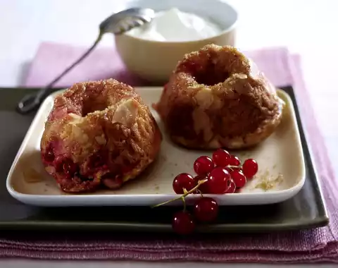 Carefully strip the berries from the panicles. Wash lemon hot, drip dry. Finely grate the peel and squeeze the juice. Add 125 g flour, eggs, half of the vanilla pulp, lemon zest, 1 pinch of salt and the leavened pre-dough and work into a smooth dough with the dough hooks of the hand mixer. One after the other, first butter, then carefully knead in the currants. Fill the greased muffin tin with 12 miniguglhupförmchen, 7 cm Ø, sprinkled with sugar and almonds. Cover with a cloth and leave to rise for about 30 minutes. Bake in the preheated oven (electric cooker: 175 °C/ convection oven: 150 °C/ gas: level 2) for about 35 minutes. In the meantime, boil up 30 g sugar, red wine, remaining vanilla pulp, lemon juice, remaining peel and liqueur for the syrup and let it cool down.