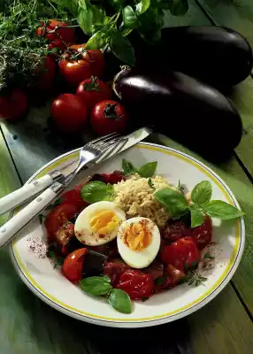 Clean and wash the aubergines and tomatoes and cut them into small pieces. Peel and chop the garlic. Put rice in boiling water and cook for about 20 minutes. Boil the eggs for about 8 minutes until soft.