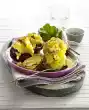 Wash the chives, shake dry and cut into small rolls. Drain eggs, quench, peel and arrange on the spinach. Sprinkle the rest of the cheese and chives on top. Add the potatoes.