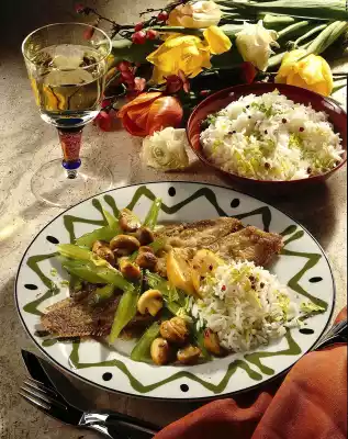 Season with salt and pepper. Add the celery and sauté briefly. Fry the rice in the remaining hot fat. Mix in celery green and pink berries. Serve everything garnished with lemon.