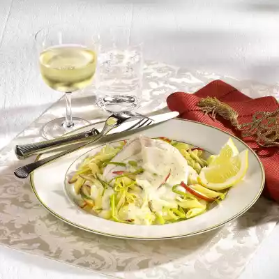 Heat butter. Steam apple and leek for about 3 minutes. Take out sole fillets and keep warm. Boil up 1/8 litre fish stock, white wine and cream. Bind with sauce thickener. Season to taste with salt and pepper.