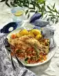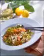 Drain the pasta, let it drain. Arrange everything on plates and garnish with lemon wedges.