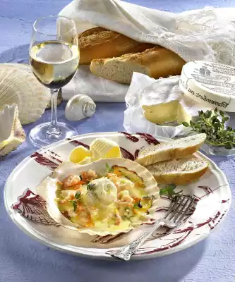 Heat the fish stock. Remove the rind from the camembert. Cut the inside roughly and melt in the hot stock while stirring. Stir in crème fraiche. Season to taste with salt and pepper. Add the shrimps