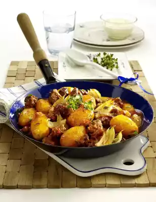 Peel and wash the potatoes, possibly cut in half and cook for about 10 minutes in boiling salted water. In the meantime peel onions and cut into slices. Wash the thyme and chop it, except for something to garnish. Heat the lard in a large pan. Fry the potatoes and onion slices for about 3 minutes at high heat.