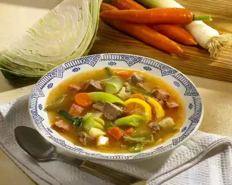 About 10 minutes before the end of the cooking time, add the meat, Jagwurst sausage and lemon slices to the pot. Season with salt and pepper and arrange in deep plates.