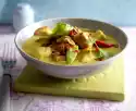 Remove the chicken meat from skin and bone and dice it. Cut the rind from the bacon. Cut bacon into small pieces. Add to the soup with the chicken meat. Season soup with salt and pepper and serve with roasted bread cubes.