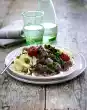Remove the meat and bacon from the stock and allow to cool. Finely puree the vegetables in the broth. Stir in almonds and bring to the boil briefly.