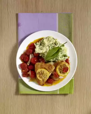 Season chicken fillets with salt and pepper and cover each with 2 lemon slices. Put them into the pan and fry them for about 6 minutes until golden brown. Turn the meat and fry on the lemon slices for another 6 minutes.