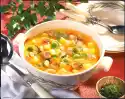 Add tomato paste and sweat briefly. Add 1 litre of water, bring to the boil and stir in the stock. Add celery and simmer for 10 minutes at low heat. After about 5 minutes add noodles to the wok.