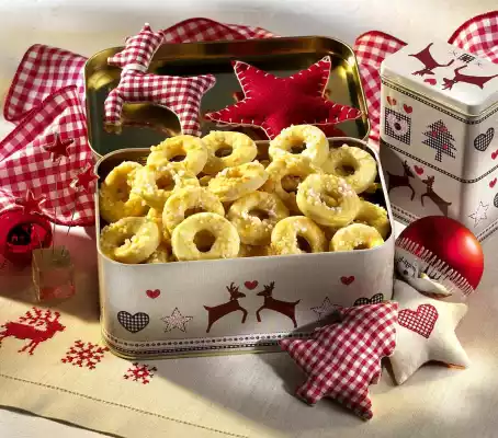 Sprinkle rings with sugar crystals. Place on 2 baking trays lined with baking paper. Bake the trays one after the other in a preheated oven (electric cooker: 175 °C/ convection oven: 150 °C/ gas: level 2) for about 15 minutes.