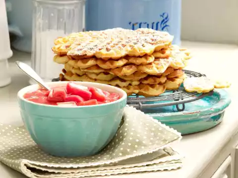 Bind the compote with it and bring to the boil briefly. Pour into a bowl and let it cool down. For the waffles, mix the fat, 250 g sugar, vanillin sugar and salt with the whisk of the hand mixer until creamy.