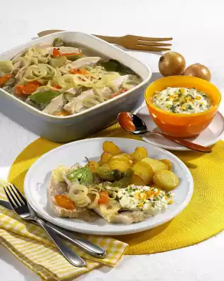 Cook the onion rings for about 3 minutes in the stock. Stir 150 ml vinegar and sugar into the stock. Season to taste with salt and pepper. Squeeze the gelatine and stir into the hot stock. Season again with salt and pepper to taste. Cut the rind from the meat and remove the bones. Cut the meat into thick slices. Cut cooked carrots and 100 g cucumber into slices. Put the meat in a bowl, pour the stock over it, let it cool down and put it in a cool place overnight. Wash the potatoes thoroughly and boil them up in a pot of water. Cover and cook for about 20 minutes. In the meantime, put eggs in boiling water and cook for about 9 minutes. Then drain, rinse with cold water and remove the skin. Let the eggs cool down. Finely dice 100 g gherkins. Wash parsley, dab dry and chop finely. Finely dice the eggs. Mix salad cream, yoghurt and sour cream.