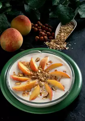 Season to taste with lemon juice and arrange on 4 plates. Wash and halve the peaches and remove the stone. Cut the fruit halves into slices and place them in a star shape on the soured milk. Sprinkle with roasted oat flakes and hazelnuts and serve.