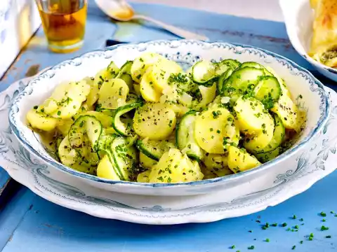 Wash the cucumber and slice or cut into fine slices. Wash chives, shake dry and cut into small rolls. Mix cucumber and chives into the salad. Is traditionally eaten with fried Maultaschen or meat cakes (meatballs).