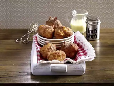 Mix 150 g sugar and cinnamon. Drain the finished doughnuts well on kitchen paper and roll them in the sugar mixture. Serve the doughnuts still lukewarm if possible. Vanilla sauce tastes good with them