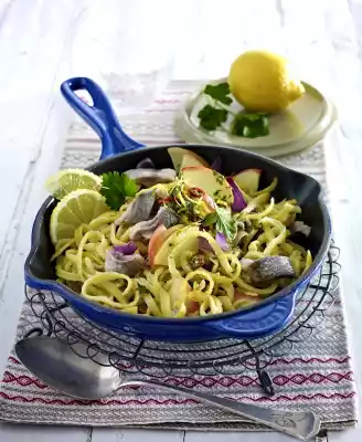 Season to taste with salt and pepper. Cut the maties into pieces. Spread the matie and gremolata over the finished spaetzle pan. Garnish with parsley and lemon.