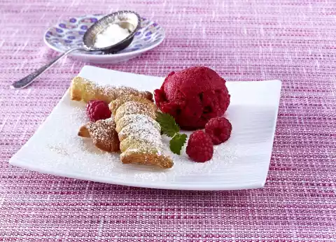 Roll out on the floured work surface to a thickness of approx. 3 mm. Cut into rectangles (5 x 8 cm) with a dough wheel. Clamp the dough rectangles in portions on a special pair of tongs for spaghetti doughnuts or place them on the end of a round piece of wood (2-3 cm Ø) and tie them up with kitchen twine. Bake the dough pieces one after the other in hot frying fat or clarified butter for approx. 3 minutes until light brown. Drain the finished doughnuts on kitchen paper. Arrange doughnuts and sorbet and decorate with raspberries and lemon balm. Dust with icing sugar