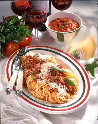In the meantime clean, wash and quarter the tomatoes. Remove seeds. Finely dice the flesh and add to the sauce for the last 2 minutes. Season the sauce again. Serve mixed with the spaghetti. Grate cheese over it. Serve garnished with sage