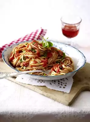 Meanwhile cook the spaghetti in plenty of boiling salted water for about 8 minutes until al dente. Drain.