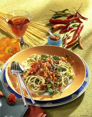 Wash the meat, dab dry and cut into fine strips. Peel garlic, press through a garlic press. Peel carrots, dice very finely. Wash, clean and roughly dice the tomatoes. Wash and chop the herbs. Wash chilli pepper, carve lengthwise, remove seeds and chop. Cook the noodles in boiling salted water for about 8 minutes.