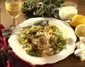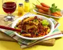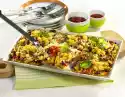 In the meantime heat up the oil. Fry garlic and lamb strips briefly. Add vegetables. Season with salt and paprika. Cook over high heat for about 5 minutes. Season to taste with some lemon juice. Serve garnished with noodles and fresh herbs