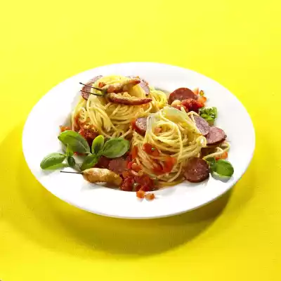 Cut Cabanossi into fine slices. Pluck the basil leaves. Heat olive oil. Stew garlic, chilli and tomatoes for about 5 minutes. Season with salt and pepper. Fold in slices of sausage. Arrange spaghetti and sauce sprinkled with basil.