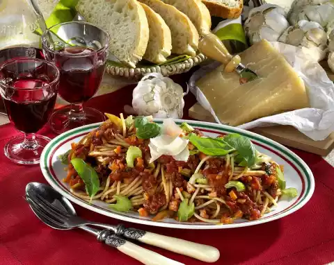 Season the sauce again. Pour the noodles into a sieve, rinse with cold water and allow to drip off a little. Mix the pasta and bolognese, arrange on a plate. Garnish with basil and parmesan slices as desired.