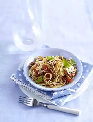 Add the stock, add the laurel. Simmer Bolognese sauce for 8-10 minutes. Prepare pasta in boiling salted water according to package instructions. Season sauce with salt, pepper and oregano. Drain the pasta and let it drain.