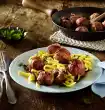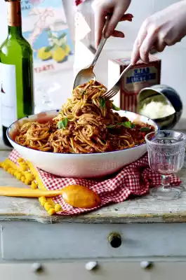Meanwhile, prepare the pasta in boiling salted water according to the instructions on the packet. Season the bolognese once again with salt, pepper, sugar and paprika. Pour the pasta into a sieve, quench briefly and drain.